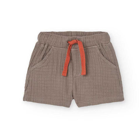 Completo due pezzi della Linea Abbigliamento Bambina Boboli,, con t-shirt in cotone fiammato e pantaloncino in garza a tinta unita con laccetti in vita.