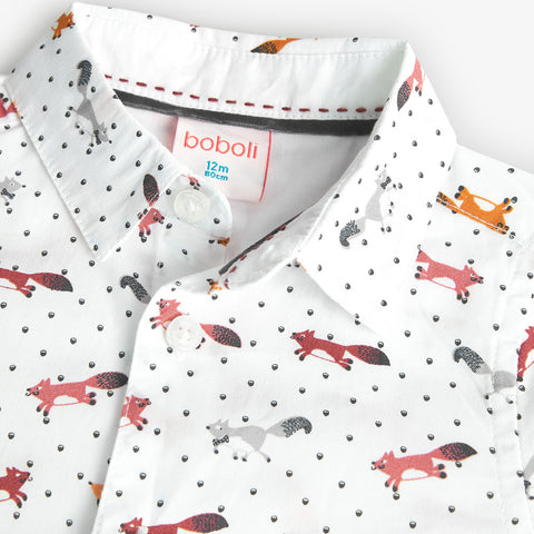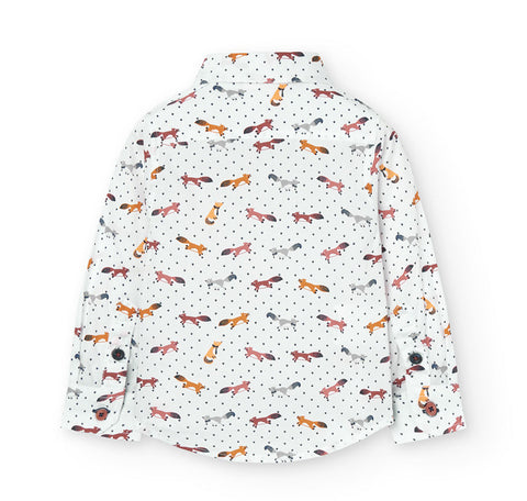 Camicia a manica lunga, della Linea Abbigliamento Bambino Boboli, con fantasia di piccole volpi colorate su fondo bianco.
