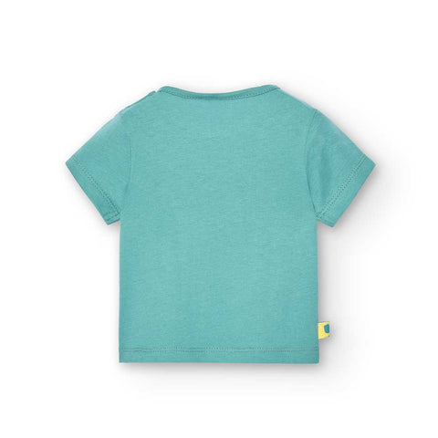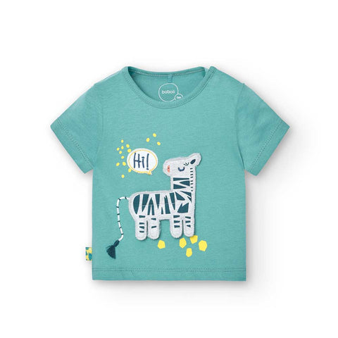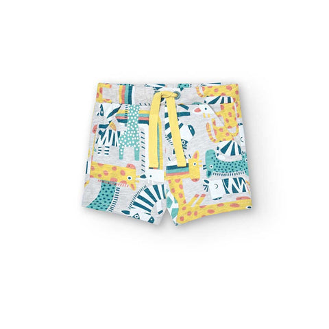 Completo due pezzi della Linea Abbigliamento Bambino Boboli, con maglietta arricchita da applicazioni in tessuto sul davanti , e pantaloncino a fantasia.