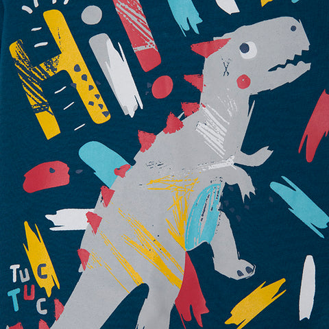 Completo due pezzi della Linea Abbigliamento Bambino Tuc Tuc composto di pantaloncino con elastico in vita e laccetti e t-shirt con bottoncini isulla spalla e stampa di dinosauro sul davanti.