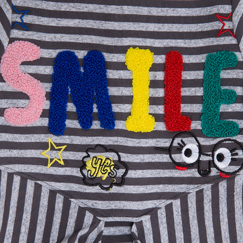 T-shirt della Linea Abbigliamento Bambina Tuc Tuc con bottoncini a pressione sul dietro, fantasia a righe e ricami multicolor sul davanti.