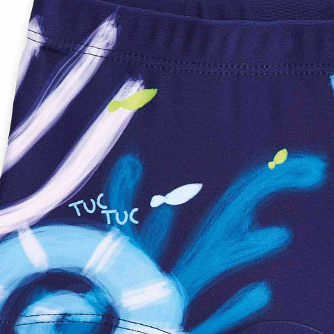 Costume boxer aderente con applicazione di cresta in tesuto su fantasia marina.