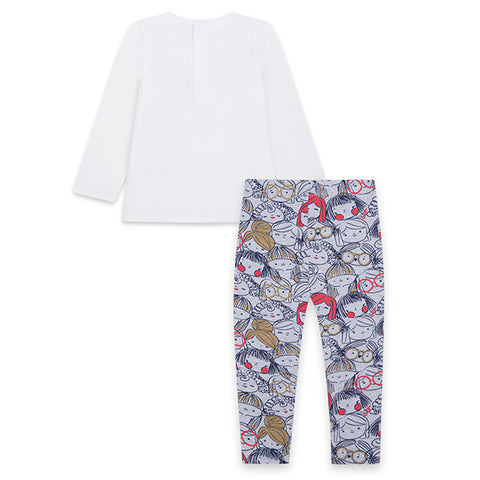 Completo 2 pezzi della Linea Abbigliamnto Bambina Tuc Tuc composto da leggins a fantasia e casacca abbottonata sul dietro con delicato disegno sul davanti.
