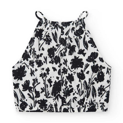 Top corto della Linea Abbigliamento Bambina Nath Kids, con bretelline corte e scollo rotondo. Fantasia floreale nero su bianco.