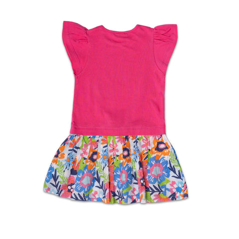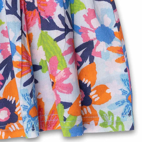 Kleines Kleid aus der Tuc Tuc Children's Clothing Line, mit Puffärmeln und farbigem Aufdruck auf der Vorderseite. Weiter Rock mit Blumen und Knoten auf der Vorderseite.