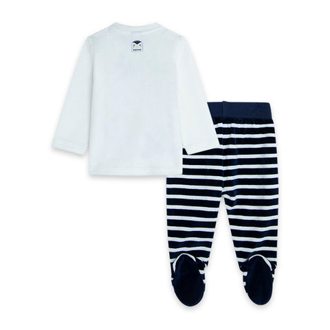 Zweiteiliger Anzug aus der Kinderbekleidungslinie Tuc Tuc, It's Cold Collection. Bestehend aus gestreifter Hose und Pullover mit Stickerei auf der Vorderseite und Druckknöpfen auf dem Rücken.