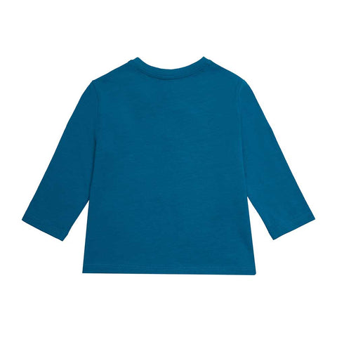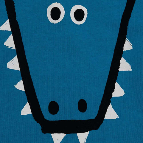 Maglietta der Kinderbekleidungslinie Tuc Tuc, mit einem Monster-Motiv auf der Vorderseite auf hellblauem Hintergrund.