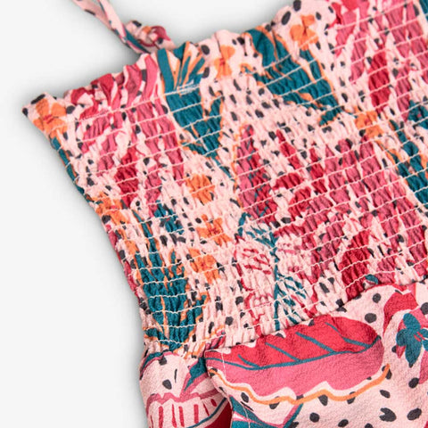 Tuta lunga della Linea Abbigliamento Bambina Boboli, in tessuto crepe, con fantasia tropicale e parte superiore elasticizzata.