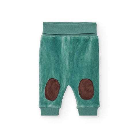 Zweiteiliges Set aus der Kinderbekleidungslinie Boboli, mit Cordhosen und einem hinten geknöpften Pullover mit Tasche vorne und einer Eichel-Applikation.