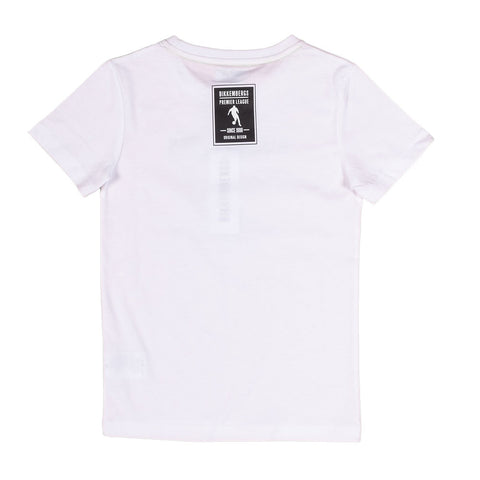 Kurzärmeliges T-Shirt der Bikkembergs Kids' Clothing Line mit geprägtem Druck auf der Vorderseite und kontrastfarbigem Logo auf der Rückseite.