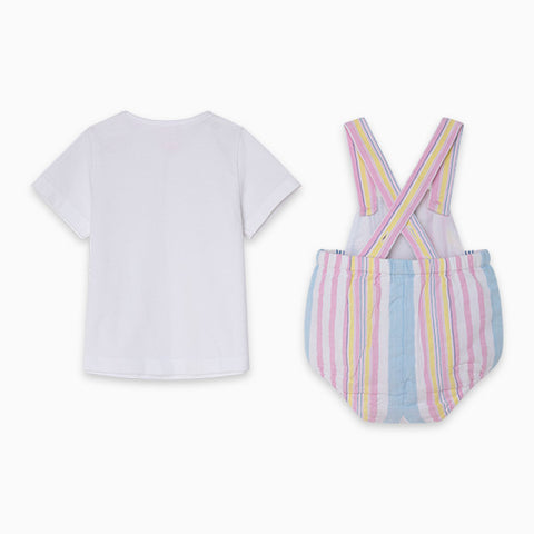 Latzhose aus der Tuc Tuc Girl's Clothing Line bestehend aus Latzhose mit Trägern und Streifenmuster und einfarbiges T-Shirt.