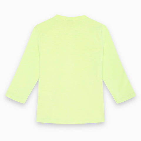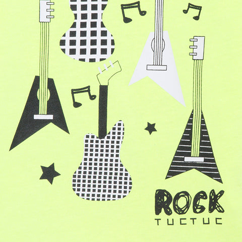 T-Shirt aus der Tuc Tuc Kinderkleidungslinie mit Knöpfen am Schultergurt a Volltonfarbe in Fluofarbe und auf der Vorderseite Designs in Kontrastfarbe.