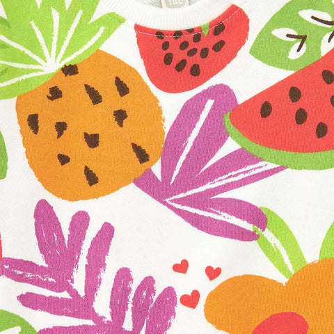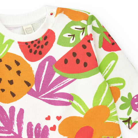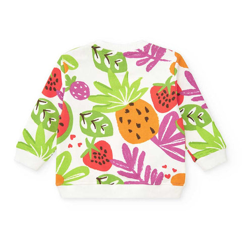 Sweatshirt aus der Tuc Tuc Girls' Clothing Line, mit Druckknöpfen am Schultergurt und tropischem Muster auf weißem Grund.