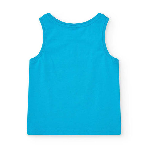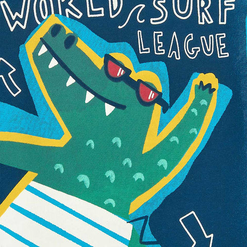 Strand-Tank-Top aus der Tuc Tuc Kids' Clothing Line, mit Krokodil-Print auf der Vorderseite auf hellblauem Hintergrund.