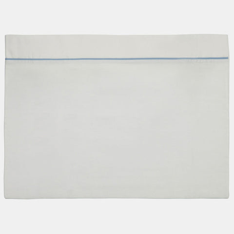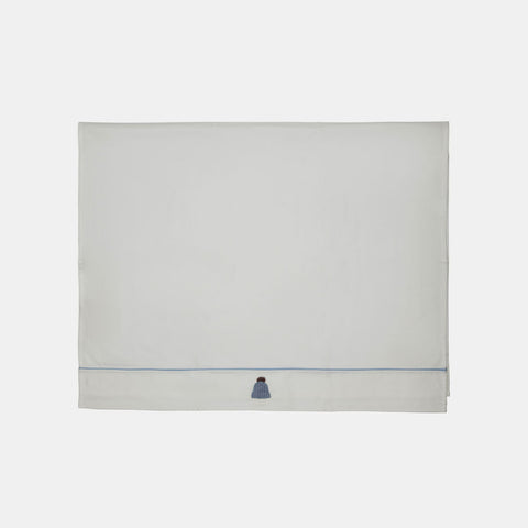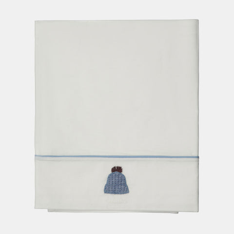 Bettlaken für Kinderwagen, aus der Lalalù Baby Line, mit hellblauer Paspelierung und Applikation einer Strickmütze.