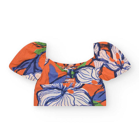 Zweiteiliger Anzug aus der Bekleidungslinie Nath Kids, mit locker sitzenden Shorts und Schmetterlingsoberteil mit buntem Blumenmuster.