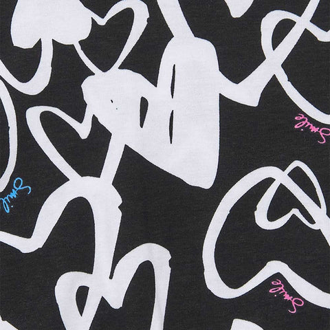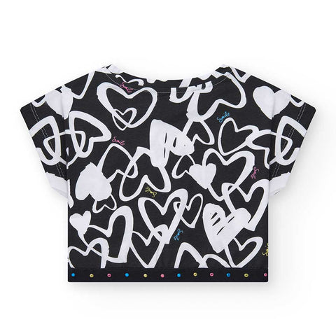 Kurzes T-Shirt der Bekleidungslinie Nath Kids, mit Gummizug am Saum und quadratischem Muster mit weiß-schwarzem Blumenmuster.