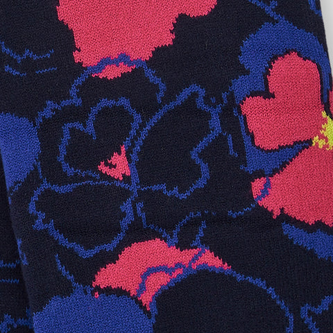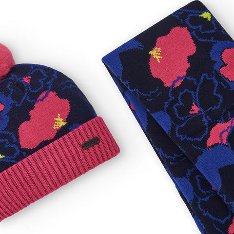 Set der Kinderbekleidungslinie Tuc Tuc, bestehend aus einer Mütze mit Bommel und einem Schal mit floralem Muster in lebendigen Farben.