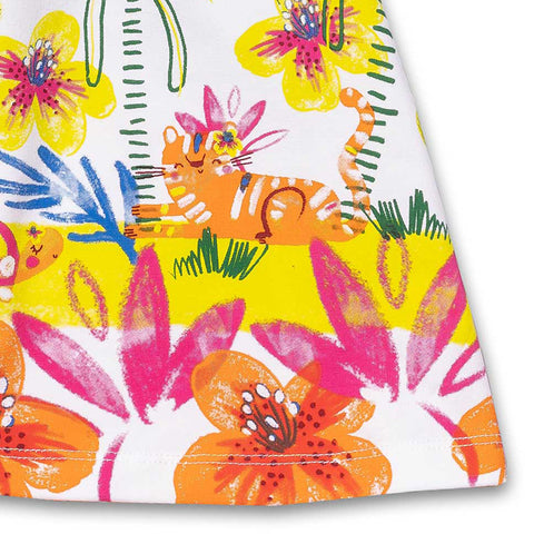 Sommerkleid aus der Tuc Tuc Children's Clothing Line, mit gekreuzten Trägern auf der Rückseite und farbigem Muster auf der Unterseite.