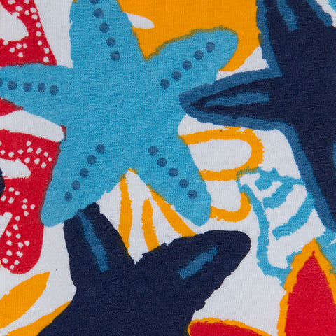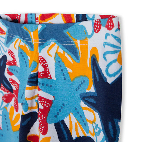 Piraten-Leggings aus der Babina Tuc Tuc Clothing Line, Red Submarine Kollektion, mit Allover-Muster aus farbigen Seesternen.