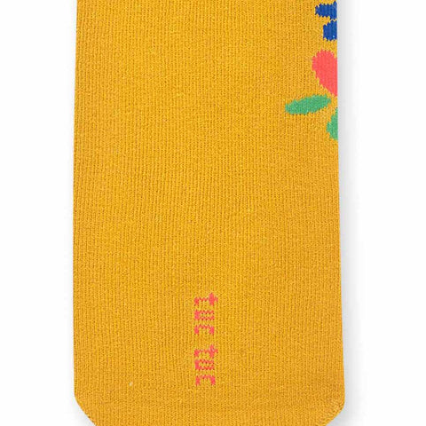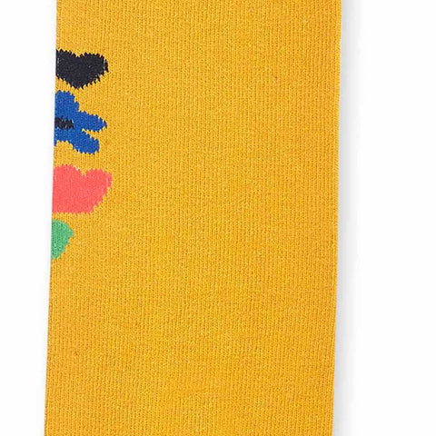 Wollstrumpfhose aus der Tuc Tuc Bmabina Clothing Line, mit Blumenmuster auf gelbem Grund.