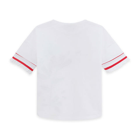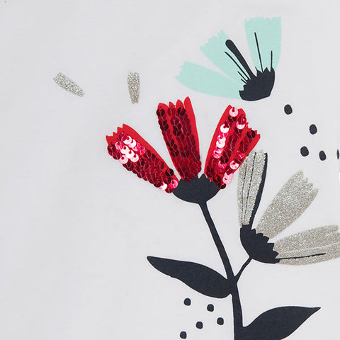 T-Shirt aus der Tuc Tuc Girl's Clothing Line, Sea Lovers Kollektion, mit bunter Druck auf der Vorderseite und Glitzer- und Paillettendetails. Anwendung von Gummizug und Locken am Rand der Ärmel.