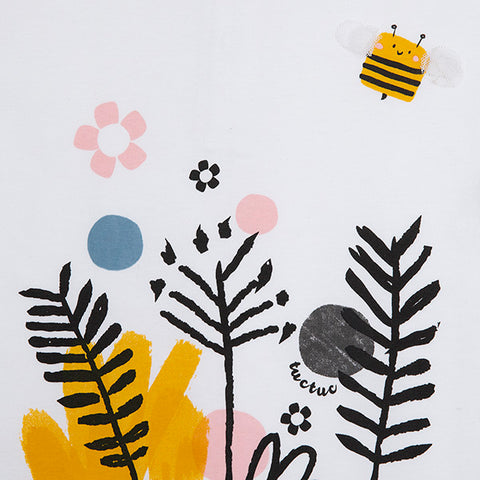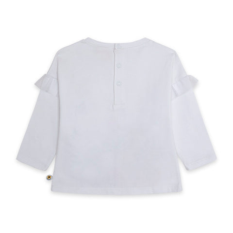 T-Shirt aus der Tuc Tuc Kinderbekleidungslinie, Bee Happy Kollektion mit Tüll an den Ärmeln und Druck auf der Vorderseite.