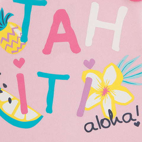 Zweiteiliger Anzug aus der Tuc Tuc Girl's Clothing Linie, Tahiti Kollektion, bestehend aus Shorts mit Blumenmuster und Oberteil mit Aufdruck auf der Vorderseite und Blume aus Stoff auf dem Schultergurt angebracht.