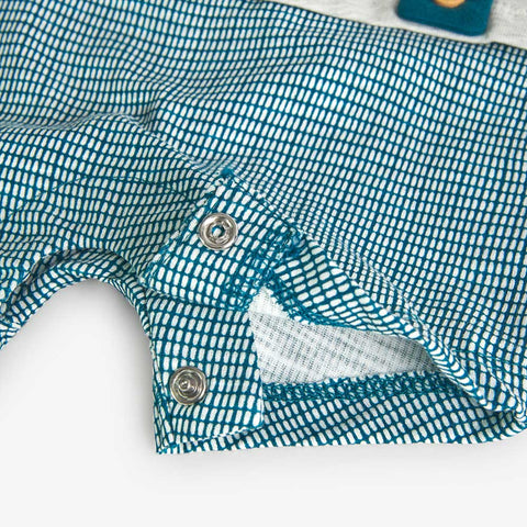 Romper from the Boboli Children's Clothing Line, with fake braces applied and colored print on the front, buttoning on the bottom and on the back.