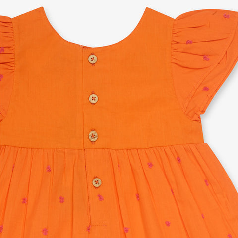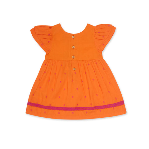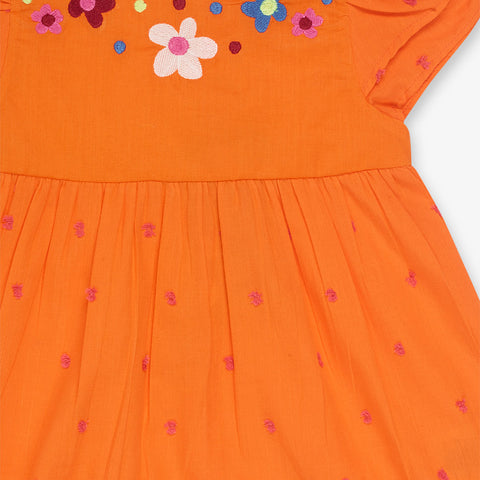 Dress from the Tuc Tuc Girls' Clothing Line, made of poplin with colorful flower embroidery on the front and buttons on the back. Lace appliqué at the hem.