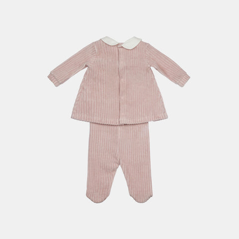 Chenille outfit from the Lalalù Children's Clothing Line, with wide ribs, with fabric collar. and rose application on the front.