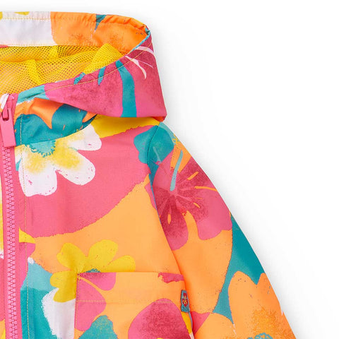 WINDPROOF JACKET from the Tuc Tuc Girls' Clothing Line, with hood and zip closure. Pockets on the front and mesh inside. The fluorescent floral pattern is beautiful.