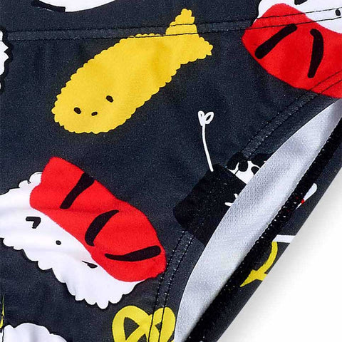 Swim briefs from the Tuc Tuc Kids Clothing Line, featuring an all-over sushi pattern.