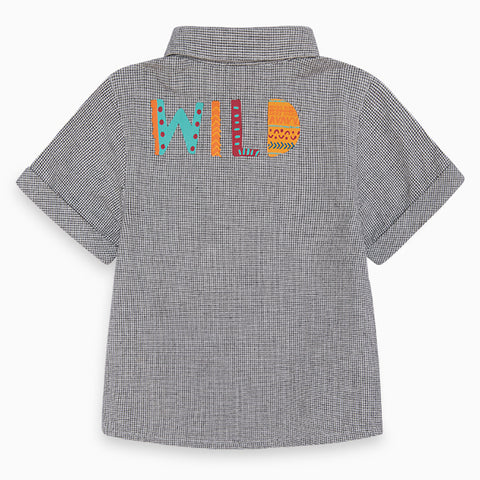 Shirt from the children's clothing line Tuc Tuc, half sleeve shirt with a small squares with colored print on the bottom.