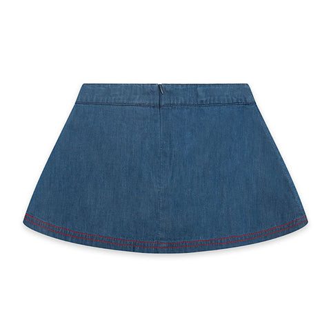 Denim skirt from the tuc Tuc girl's clothing line, with embroidery on the side and adjustable waist size.
