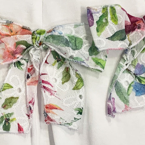 Jersey jumpsuit from the Lalalù Girls' Clothing line, with colored lace collar and bows applied on the front.