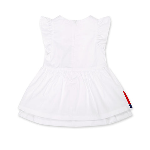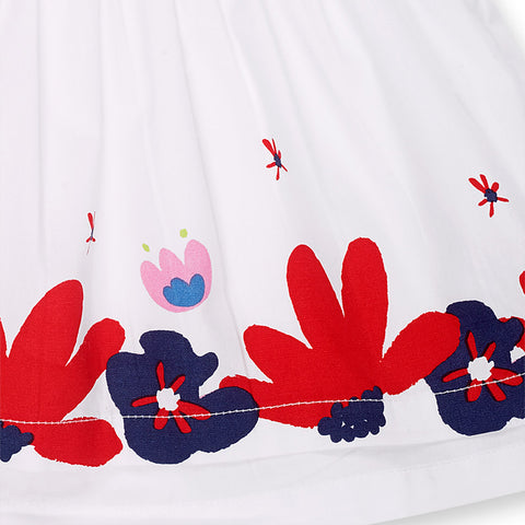 Dress in poplin from the tuc Tuc Girls' Clothing Line, featuring a full skirt and ruffles on the shoulders. Colorful prints on the front and hem.