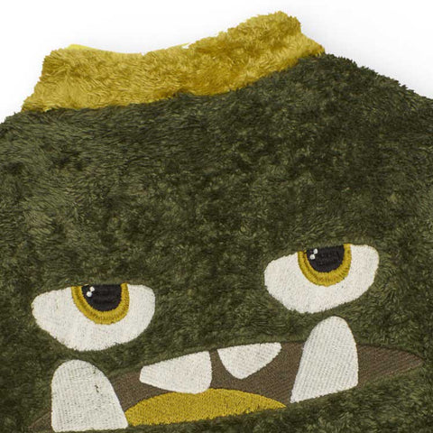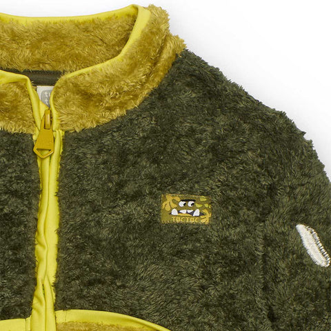Veste en fausse fourrure de la ligne Vêtements Enfant Tuc Tuc, avec fermeture éclair, poches à l'avant et monstre brodé dans le dos.