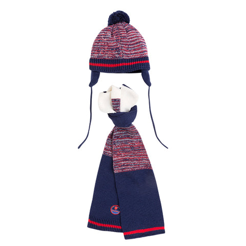 Completo bonnet et écharpe de la ligne Vêtements Enfant Tuc Tuc, tricotés en bandes en jersey endroit. Bonnet équipé de cache-oreilles et d'un pompon.