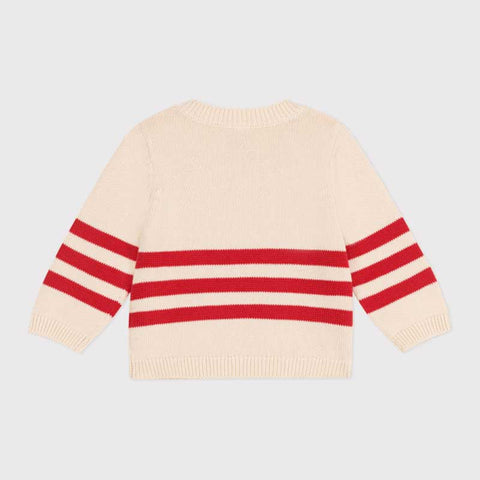 Pull-over de la ligne Vêtements Enfant Petit Bateau en maille de coton avec rayures appliquées et écusson vintage sur le cœur. Pull-over marin intemporel revisité avec des rayures appliquées. Facile à enfiler grâce à l'ouverture avec boutons sur l'épaule.