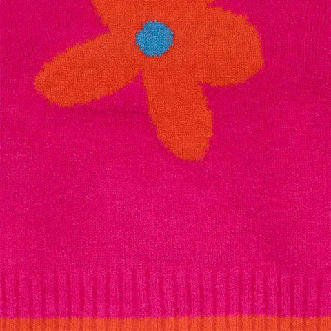 Pull de la ligne Vêtements Fille Tuc Tuc, avec des petits boutons en bois sur l'épaule. Au centre, dessin de fleur en couleurs fluo sur fond fuchsia.