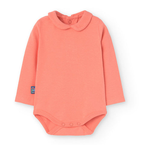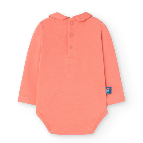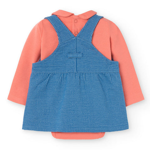 Ensemble deux pièces de la Ligne Vêtements Fille Boboli, avec salopette jupe à rayures avec broderie sur le devant, t-shirt uni avec col rond.