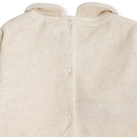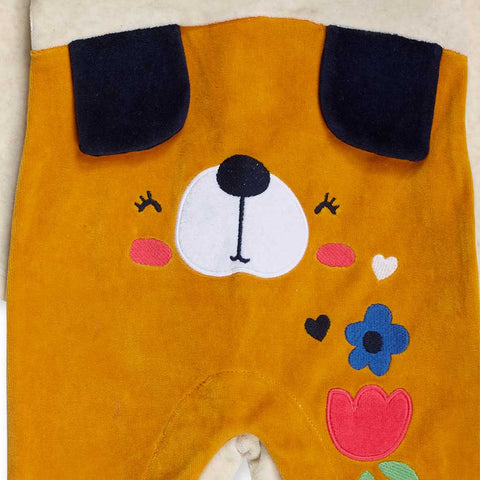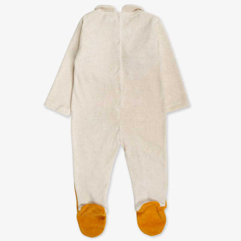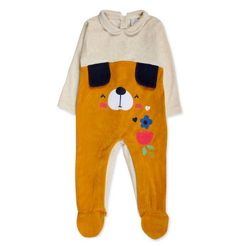 Combinaison en velours côtelé de la ligne Vêtements Fille Tuc Tuc, avec col rond, boutonnage au dos et à la base. Sur le devant, applications en tissu et broderies colorées.