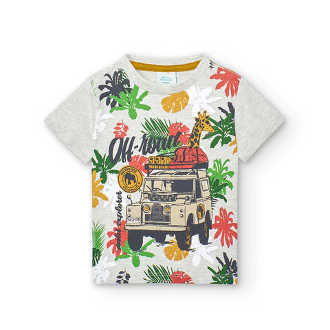 Ensemble deux pièces de la Ligne Vêtements Enfant Boboli, avec un t-shirt à motif safari et un short uni avec élastique à la taille.