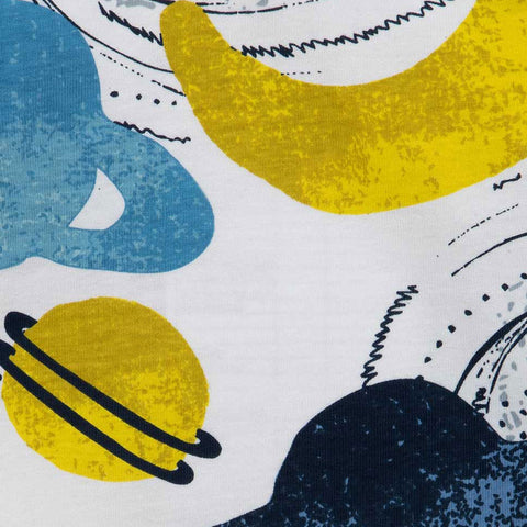 Maglietta de la Ligne Vêtements Enfant Tuc Tuc, avec un motif de planètes multicolores partout.