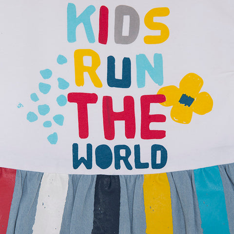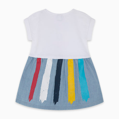 Robe de la ligne Vêtements Fille Tuc Tuc avec une large jupe en denim léger, revers aux manches et impression multicolore sur le devant.