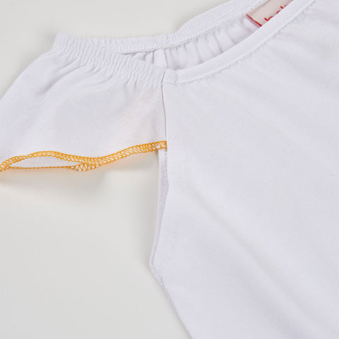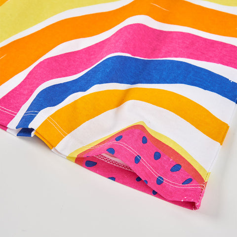 Robe de la ligne de vêtements pour fille Boboli, coupe évasée et imprimé coloré sur fond blanc. Ruches sur les manches.
