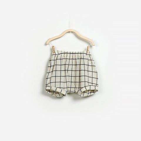 Shorts de la ligne vêtements enfant Play Up avec modèle ballon et cordon à la taille. Magnifique motif à carreaux foncés sur fond blanc cassé. Composition : 100 % COTON