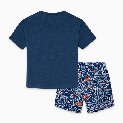 Ensemble deux pièces de la Ligne Vêtements Enfant Tuc Tuc composé d'un short à motif et d'un t-shirt avec dessins marins.