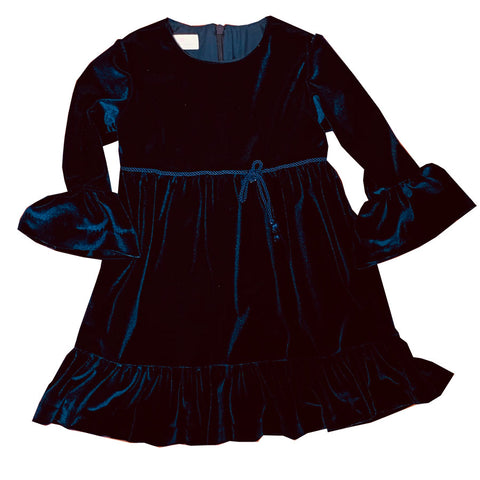 Modello classico in vellutto con cordoncino in vita e polsini a sbuffo.